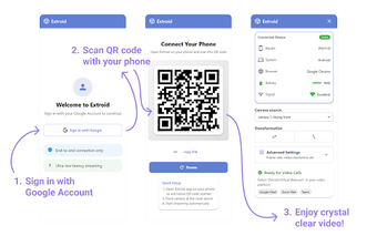 Extroid è un'estensione per Chrome che trasforma il tuo smartphone Android in una webcam wireless di alta qualità per videochiamate su piattaforme come Zoom e Google Meet. Non richiede installazioni complicate; basta scansionare un codice QR per iniziare a trasmettere. Questo strumento si distingue per la sua capacità di utilizzare la fotocamera del telefono, offrendo una qualità video superiore rispetto alle webcam integrate dei laptop. Inoltre, non utilizza server cloud, garantendo la privacy dei dati durante le sessioni di streaming.